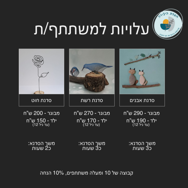 • ניתן לקיים סדנאות גם ל־ימי גיבוש, מסיבות, מפגשים משפחתיים,