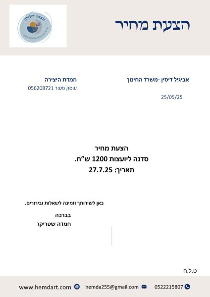 סדנת חוטים מחבריםביקורתהגענו לסדנא למפגש סיום שנה חוויתי. חמדה אשה מדהימה, יצירתית, נדיבה ובעלת סבלנות נדירה. גם מי שפחות יצירתית או מרגישה עם "שתי ידיים שמאליות" התחברה והצליחה ליצור יצירות מקסימות. הסדנא- מקסימה האירוח- אין מילים! חייבית לציין כי חמדה ידעה שאנחנו קבוצה חרדית ודאגה שכל הכיבוד יהיה בד"צ כדי שנוכל להתכבד ללא חשש החוויה הכללית היתה נהדרת אני בטוחה שאחזור אליה פעם נוספת ממליצה בחוםמחירזמינותשירותאיכות